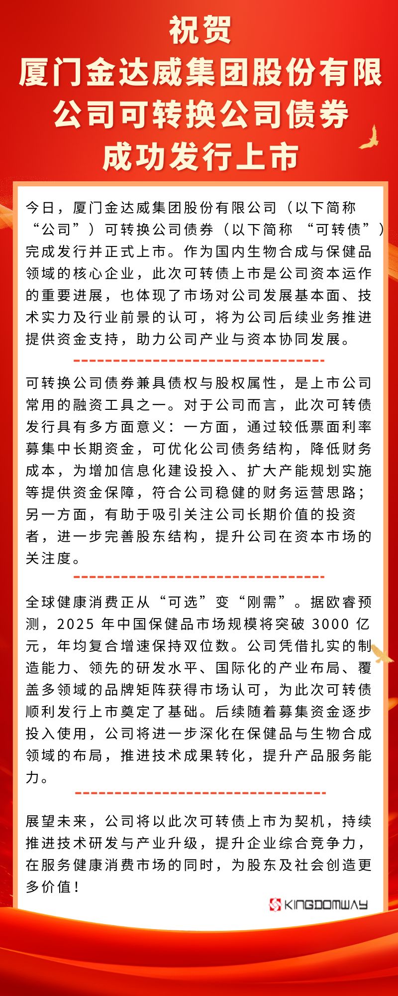 祝賀廈門金達威集團股份有限公司可轉換公司債券成功發行上市